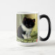 Mug magique avec un chaton tuxedo chéri ! Ce chaton noir et blanc pose à couteaux verts et rouges. Un cadeau merveilleux pour les amoureux de les chats et les amateurs d'art victorien !