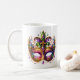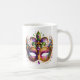 This coffee mug is shown in white with a Mardi Gras mask art print.