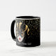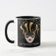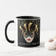 Cette tasse combo noir et blanc a l'image d'un Mardi Gras masques sur de petites étoiles dorées sur un arrière - plan noir. Le texte de "Let the good times roll" se trouve sous le masque de chaque côté de la tasse. Customisez cet objet ou achetez tel que conçu. Couleurs : manche et intérieur rouge, arrière - plan noir, étoiles dorées et masques noir et or. Images et texte imprimés sur.