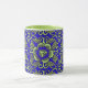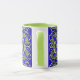 11 g/m2. Coffee Mug à motifs de médaillon de fleurs. arrière - plan bleu vif au design floral vert citron et noir stylisé. Poignée et intérieur vert citron.