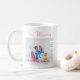 Personnalisez cette tasse photo simple et moderne pour votre mère. Le modèle est mis en place pour que vous puissiez ajouter votre nom et l'année - vous pouvez également modifier n'importe quel exemple de libellé si vous le souhaitez. Exemple de texte actuellement dit "Meilleure maman dans l'univers", [année], "Les câlins et les baisers [votre nom]". Le design a une jolie palette de couleurs féminines de pêche corallienne et bleu d'été. Il présente des coeurs et des fleurs griffés et combine une police en majuscules audacieuse avec une typographie de script élégante. Beau cadeau photo de votre enfant, ou des enfants, pour la journée de la mère, un anniversaire ou juste parce que. Parcourez notre magasin pour trouver des modèles alternatifs ou des produits de coordination.