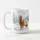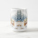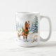 Super mignon tasse de Noël qui a un aquarelle d'air de l'illustration d'un Shetland Pony debout dans un terrain de vacances fantasque pendant une journée d'hiver enneigé avec un fond de pins.