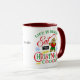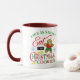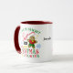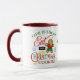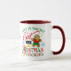 Voici une mignonne tasse à café qui déclare : "La vie est courte. Mangez les COOKIES DE NOËL". Un homme en pain d'épices coloré sourit à côté du texte rouge et vert. Quelques flocons bleus dérivent autour de l'image. L'image est imprimée sur deux côtés, avec votre nom ou autre texte personnalisé au centre entre eux. Holiday Fun!