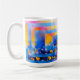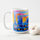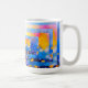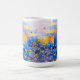Bright abstract flower fields in blue and gold wrap a glossy white ceramic mug.