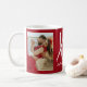 Modern Script XO Year Photo Mug. Celebrate your unique love story with this elegant and modern photo design. Featuring a striking red background and a chic white script "XO" design, you can showcase ttwo of your favorite memories in a stylish grid. It is the perfect personalized home decor accent, and makes a thoughtful gift for Valentine’s Day, weddings, anniversaries, or birthdays. Upload your favorite photos and change the year to the current year. Background color and font colors can be changed in the design edit tool. Adjust photos as needed. Contact designer with any customization questions.