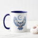 This unique and mystical mug design features a blue owl with outstretched, pattern image wings. His penetrating eyes look straight ahead and claws are outstretched. In the distance, behind and above him, is a crescent mood and silvery blue stars. The image is printed on two sides of the mug, and your name, monogram, or other text is between them. Everything stands out on a crisp white background.