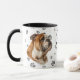 This mug for the Bulldog owner features a portrait of a beautiful brown and white Bulldog. The image is printed twice, and between them is an oval with the black text that says "Love my French Bulldog". Your monogram or name is at the bottom. The oval, monogram, and dog images are placed on a background sprinkled with paw prints. You may easily change the text to something else if you'd like.