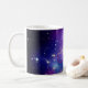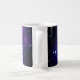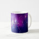Créez votre propre tasse de café monogrammé blanc et violet girly pour une demoiselle d'honneur. Customisez l'élégant style de calligraphie moderne violet, noir et blanc, taille et couleur du nom et de l'initiale. Vous pouvez conserver ou supprimer le texte de l'ombre portée conçu pour aider le monogramme à se démarquer de l'image arrière - plan. L'exemple de photo est une jolie image spatiale adaptée de façon créative d'une capture Hubble de la NASA du Galaxy Cluster MACS J0717. Les couleurs principales de la photo sont le noir, bleu marine, bleu, magenta, violet, blanc avec des zones nuageuses brumeuses et scintillantes étoiles. Retirez ou conservez l'option de superposition du filtre photo dans le système lorsque vous customisez cette conception.