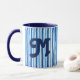 J'ai créé cette tasse monogramme nautique avec un motif rayé peint à la main dans deux tons de bleu sur du papier blanc. Bleu et blanc rayures pour un bon début de journée !