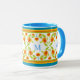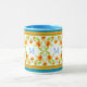 Un joli Ringer Mug floral à personnaliser avec un monogramme ou des initiales, avec une bordure de fleurs Pot Marigold, haut et bas et une lèvre et une poignée bleu vif. Une partie de la collection Posh & Painterly 'Marigold Medley'.