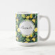 Une tasse avec un joli motif aux citrons jaunes et aux citrons verts aux tiges de feuilles posée sur un arrière - plan vert foncé.