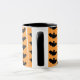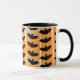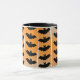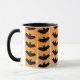 Tasse à café pour Halloween avec ma conception de chauves-souris noires volantes sur un arrière - plan orange et blanc.