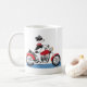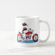 Un chien conduit une moto rouge. Ses oreilles, son foulard et sa queue volent dans le vent et son casque a des décalcomanies.