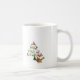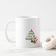 Un sapin de Noël rouge, blanc et vert, très joyeux avec un oiseau dans un chapeau de Père Noël qui regarde.