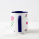 Une jolie tasse blanche avec lèvre et poignée bleu foncé et un design floral rose et vert qui imite l'application ou la courtepointe, d'un collage de papier peint à la main par Judy Adamson.