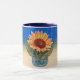 Un seul tournesol reposant dans un vase bleu clair sur un arrière - plan bleu à or.