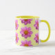 Un motif de dahlias roses sur un arrière - plan jaune. Même si les fleurs ne fleurissent pas dans le jardin, elles le sont quand vous atteignez cette tasse. Pensez à l'été quand vous buvez votre café ou thé.