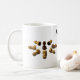 Un pion d'échecs marron entouré de sept pions blancs-jaunâtres pondus. Ninja victoire sur les ennemis. Tasse à café amusante. Deux images du côté extérieur et intérieur. Vous pouvez modifier ou supprimer les images et le texte Ninja.