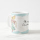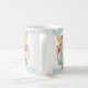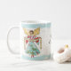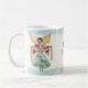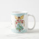 Cette tasse est décorée d'un délicat ange de Noël. Elle porte une robe florale bleue, rouge et verte, et ses ailes sont colorées d'un motif doré. Elle tient une bannière avec "20xx" pour vous personnaliser avec l'année. Texte central : "Joyeux Noël". L'Arrière - plan est de la musique de feuilles fanées avec une bordure bleue.