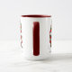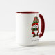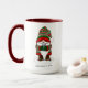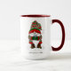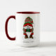 Un joli gnome de Noël tout en rouge et blanc tient une tasse de chocolat chaud.