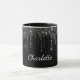 Une chaise élégante, fillette et glamour. Un arrière - plan noir chic décoré avec des gouttes de parties scintillant, la peinture goutte à goutte. Personnalisez et ajoutez votre nom écrit avec un script de style manuscrit. Lettres de couleur blanche.