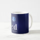 Un arrière - plan bleu marine. La couleur bleue est inégale. Décoré avec ancre de navire et volant. Personnalisez et ajoutez un nom et des initiales monographiques. Le nom est écrit en blanc avec des lettres en bloc modernes.