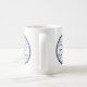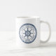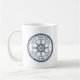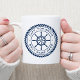 Tasse à café avec un élégant emblème de roue et de corde bleu foncé avec le nom de votre capitaine et le nom du bateau sur un arrière - plan blanc.