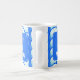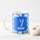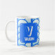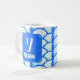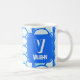 Cette tasse monogramme est une excellente façon d'ajouter un accent unique à votre routine matinale. Un motif géométrique bleu vif apparaît contre un arrière - plan bleu clair. La lettre "V" est présentée dans un carré avec le nom de famille. La lettre et votre nom peuvent rapidement et facilement être personnalisés. Design original - C. McGouldrick