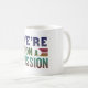 nous sommes sur la mission Coffee Mug. Cette image montre une tasse blanche avec une poignée sur le côté droit. Sur la tasse, il y a du texte dans différentes polices et couleurs qui dit "NOUS SOMMES EN MISSION". Le texte est disposé de telle sorte que chaque mot soit placé sur une ligne distincte, avec "NOUS SOMMES" en haut, "ON A" au milieu, et "MISSION" en bas. Il dégage un sens du but et de la détermination, comme si la tasse elle-même faisait partie d'un voyage significatif.