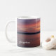 Une belle photo au coucher du soleil de Destei avec des tons orange et violet sur un lac calme. Cette tasse comprend de l'espace pour personnaliser avec un nom, ce qui en fait un cadeau paisible et réfléchi pour toute personne qui aime la nature, des moments lents ou la lumière chaude du soir.