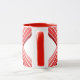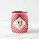 Lignes rouges dans les cinq nuances variables Sombre à lumière, du bas au haut. Deux séries de bandes sont croisées, formant un carré au milieu. Personnalisez avec votre Initiale au centre du carré.