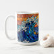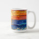 A coffee cup with an illustration of a stained glass mosaic ocean waves and sunset illustration.