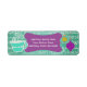 Holiday return address labels with a teal and white topography background, a steaming mug of cocoa, ornaments, and a purple frame where you can add your name and address before ordering.