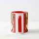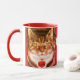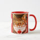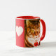 Striped cat on mug with red trim. White heart in center on red background.Art by Patricia Villa.