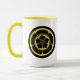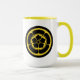 Buvez votre café de cette grande tasse combo avec cet Oda Mon en jaune sur noir. Oda mon du shogunat japonais. Le mon est un emblème pour désigner une famille, un clan ou même une organisation. Le kamon est utilisé spécifiquement pour identifier une famille. Le mon est semblable aux armoiries de la tradition héraldique européenne. Bien qu'il y ait une grande différence, le mon reste propre et minimaliste dans le design. Les crêtes européennes ont tendance à devenir très compliquées en combinant d'autres crêtes familiales au fil des générations. Mon et Kamon sont généralement conçus à l'aide d'une rondelle contenant une image abstraite et stylisée d'un objet. Cet objet peut être un plante, un animal, un outil ou tout ce que vous voulez. Cela mènera à une grande quantité de catégories contenant de nombreuses variantes d'un objet particulier. Bien que nous finissions avec des milliers de lun, grâce à son design minimaliste et même moderne, mon et kamon ne sont jamais ennuyeux. Ils ont l'air absolument beaux sur n'importe quel article.