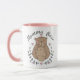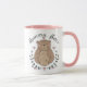 Belle illustration d'un bébé ours qui embrasse sa maman avec les mots "Momma Bear." Des coeurs roses et des feuilles verts entourent l'image.