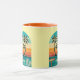Cette tasse à café de plage colorée a un look rétro avec un design graphique stylisé de palmiers courbés et encadrés par une arche de couchers de soleil et de couleurs du ciel dans des rayures de populaire turquoise, or, orange et rouge. Les palmiers surplombent du bois de plage turquoise en dur, avec un panneau de plage et des tongs devant. Vos initiales de monogramme apparaissent dans une couleur or, alors assurez-vous de modifier les espaces réservés dans la section Personnalisée. L'arrière - plan de la tasse - tout sauf la zone de poignée - est dans un jaune pâle, et l'option présentée ici comprend une poignée et une tasse "couleur coucher de soleil" orange foncé à l'intérieur. D'autres options de mug et de stein sont disponibles.