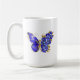 Bijoux, bleu, saphir, papillon aux fleurs pétillantes avec aile décorée de bleu, fleurs précieuses avec feuilles d'or sur arrière - plan blanc.