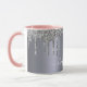 Une tasse monogrammée fillette et tendance. Un arrière - plan chic à l'aspect faux argent décoré de gouttes de parties scintillant faux, la peinture goutte à goutte. Personnalisez et ajoutez un nom et une lettre monogramme. Lettres blanches et grises. Le nom est écrit avec un script de style moderne écrit à la main avec des swashes. Pour que les swashes ne suppriment que le nom de l'échantillon, laissez les espaces ou émoticônes devant et après le nom.