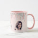 Une tasse monogrammée fillette et tendance. Une arrière - plan rose vif et féminine décorée de gouttes de parties scintillant rose or et argent. Personnalisez et ajoutez un nom et une lettre monogramme. Ajoutez votre propre photo x 2. Lettres noires et grises. Le nom est écrit avec un script de style moderne écrit à la main.