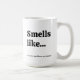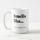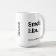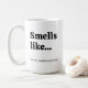 Une tasse à café personnalisée est accompagnée du dicton : "Ça sent comme...ce n'est plus mon problème." à l'avant et à l'arrière et votre nom sur le côté. Idéal pour vous-même ou donner en cadeau.