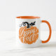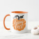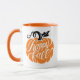 Cette tasse de style ferme présente un design citrouille avec les mots "Happy Fall". Sur le dos est une conception en double.