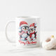 Cette tasse à café monogrammed blanc et rouge festive présente un mignon couple de pingouins patineurs de glace, le dicton "Joyeux Noël" et le modèle du nom de famille. Ajoutez votre nom de famille avant de commander pour créer des accessoires de cuisine uniques pour la saison des fêtes.