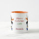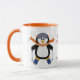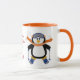 Cette mignonne tasse présente un adorable manchot de ski de neige et votre propre texte personnalisé. Le pingouin est habillé d'une écharpe orange et de lunettes bleues, et il est en train de se coiffer sur son ski. Quelques flocons de neige coulent autour de lui. L'image est répétée deux fois, avec trois champs de texte pour votre texte personnalisé entre les deux. Festif et lumineux !