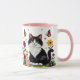A sweet personalized coffee cup with a cute illustration of a black and white cat surrounded by flowers and butterflies in a paper quilling impasto style.