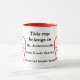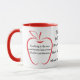 Deux contours rouges de pommes sont positionnés de chaque côté de ce produit. Les devis sont imprimés dans chaque pomme. L'un dit : "L'enseignement est la seule profession qui crée toutes les autres professions." L'autre pomme dit, "Les meilleurs enseignants enseignent du coeur, pas du livre." Entre ces deux pommes se trouvent les mots : Cette tasse appartient à M. Andersonville, Enseignant de 6e année, Memorial Grade School (tout cela peut être personnalisé). Tous les mots sont imprimés en noir.