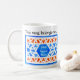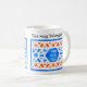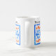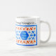Une jolie tasse blanche avec un motif islamique traditionnel en bleu, orange et blanc, le dos et l'avant. Le texte autour de la jante dit, "Cette tasse appartient à..." en lettres noires et il y a un panneau au milieu de la conception où vous pouvez mettre le nom que vous voulez. Ce dessin a été peint à la main par Judy Adamson.