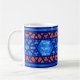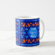 Une jolie tasse blanche avec un motif islamique traditionnel en treillis dans deux teintes de bleu et d'orange dos et devant. Il y a un panneau au milieu de la conception où vous pouvez mettre le nom que vous voulez. Ce dessin a été peint à la main par Judy Adamson.