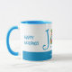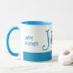 JOIE festive, amusante, JOIE AU MONDE FÊTE DE Noël Mug. Le texte dit JOY TO THE WORLD en typographie bleu cyan. L'O in JOY est représenté par un pudding festif de Noël, avec une sélection de DRAPEAUX DU MONDE. A gauche, le texte dit HAPPY HOLIDAYS et à droite, il dit BONNES FÊTES - toutes deux sont PERSONNALISABLES. En dessous, il y a un nom d'espace réservé dans une bande bleue cyan, que vous pouvez également remplacer par votre nom ou texte, qui tourne autour de la largeur de la tasse. La version de Christian Scripture est également disponible.