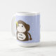 Un mignon singe avec un gros grain, une fourrure brun foncé et une banane cachée derrière son oreille. Un arrière - plan bleu avec des points blancs et une bordure jaune. Les mots "petit singe" peuvent être changés à votre gré.